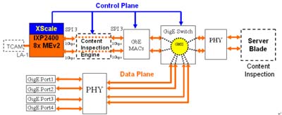 網(wǎng)絡(luò)安全系統(tǒng)內(nèi)最關(guān)鍵性的功能可以說是封包表頭辨識(Classification)及內(nèi)容檢查(Content Inspection),表頭辨識系針對其流向、連結(jié)、輸入端口及目的地址等做比對;內(nèi)容檢查則有復雜的算法,處理頻寬及內(nèi)存容量需求極高,很顯然內(nèi)容檢查即將是此系統(tǒng)非常嚴重的交通瓶頸所在,這個運算將耗用大量IXP-2400網(wǎng)絡(luò)處理器的運算資源。因此必須采用另一個處理器卸載此運算,有兩種方法可行,其一是如圖四:加入一顆個可程序內(nèi)容檢查引擎(Programmable CIE, Content Inspection Engine),比如IDT PAX.port 2500 CIE;或是在封包經(jīng)網(wǎng)絡(luò)處理器集結(jié)成較大封包后,進入一張專屬內(nèi)容檢查的高速運算服務(wù)器,比如ADLINK cPCI-6860 Dual-Xeon Server Blade。加CIE的做法可以卸載95% 的MicroEngine資源使用量,刪除掉85%的MicroCode,同時削減75%內(nèi)存頻寬使用量,成本可大大節(jié)省,TTM(Time to Market)時間可以顯著縮減。加一張專屬服務(wù)器則維持舊有軟件延續(xù)使用,節(jié)省軟件開發(fā)的時間及人力成本,兩者各有優(yōu)點,但是CIE是純硬件運算所以效率較好,長期來看應(yīng)會成為較受歡迎的選擇。