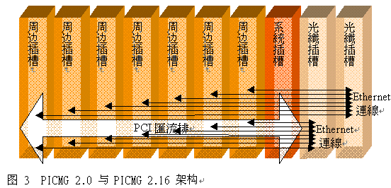 在2001年9月,PICMG協(xié)會(huì)核準(zhǔn)PICMG 2.16 封包交換背板(Packet Switched Backplane)規(guī)格,本規(guī)格對(duì)于在一個(gè)CompactPCI架構(gòu)里外圍插槽(peripheral slots)與光纖插槽(fabric slots)之間10/100/1000Mbit Ethernet的互聯(lián)做了詳細(xì)定義。光纖插槽是相互備援的,PICMG2.16兼容系統(tǒng)已被廣泛應(yīng)用于多種用途上,Ethernet互聯(lián)與IP數(shù)據(jù)傳輸需求的普遍特性促使系統(tǒng)提供者廣泛采用此規(guī)格。圖3顯示典型的PICMG2.0與2.16架構(gòu)。