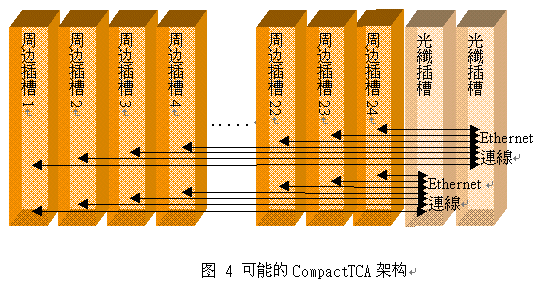 3.0)所定義的系統(tǒng)管理能力、PICMG 2.0所定義的標(biāo)準(zhǔn)機(jī)箱(Form Factor)及PICMG 2.16所定義的數(shù)據(jù)傳輸。這種架構(gòu)將不包含PCI總線,在此架構(gòu)下的系統(tǒng)將能夠支持24個(gè)外圍插槽與2個(gè)光纖插槽。摒除PCI總線將可降低CompactPCI