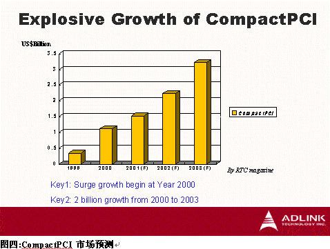 Magazine 估計(jì),CompactPCI市場將由1999年的美金$350 Million成長到2003年的美金$3200 Million,年復(fù)合成長率高達(dá)45.6%,其中又以2002年至2003年最大幅成長。CompactPCI為工業(yè)計(jì)算機(jī)產(chǎn)業(yè)開拓了一個(gè)以往傳統(tǒng)工業(yè)計(jì)算機(jī)無法應(yīng)用的新市場,而CompactPCI需針對電信等級(jí)應(yīng)用提供高可靠度及達(dá)到嚴(yán)苛高品質(zhì)要求,卻又為傳統(tǒng)工業(yè)計(jì)算機(jī)廠商豎立高進(jìn)入障礙,因此,目前能提供電信級(jí)CompactPCI寬頻通訊平臺(tái)幾為國外廠商,如Motorola、Ziatech、Force