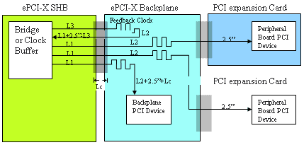 由于加了PCI-X,底板上的時鐘的長度就成為關鍵了。規(guī)范的作者要定義應能與各種底板互操作的SHB。這挑戰(zhàn)是在SHB上的PCI-X接口需要一個具有相等于底板上時鐘走線長度延時的反饋時鐘。這反饋時鐘是在底板上并且它的長度是以從SHB插槽到PCI插板插槽的時鐘的長度為基礎的。在下面畫的圖中,從橋到三個目的地中任何一個的時鐘距離是相同長度的。