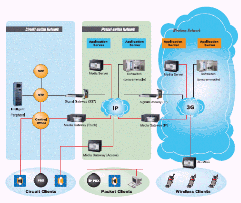 、隨選視訊(Video Streaming) 等應(yīng)用,著重在聲音影像,深具高度收益的潛力,而被服務(wù)供貨商大力推廣。但是服務(wù)提供業(yè)者為了讓使用者能輕易的在現(xiàn)行設(shè)備上溝通聲音影像,必須肩負(fù)極高的成本,同時運(yùn)營兩種網(wǎng)絡(luò)。因此在不損壞傳統(tǒng)語音網(wǎng)絡(luò)穩(wěn)定運(yùn)作而又能快速建置整合新一代IP通訊建設(shè)的限制下,『寬頻通訊平臺』便以網(wǎng)關(guān)(Gateway)的形式出現(xiàn)扮演接口角色,成為網(wǎng)絡(luò)設(shè)備供貨商及電信系統(tǒng)業(yè)者最佳的解決方案。不但同時支持IP網(wǎng)絡(luò)又負(fù)起和傳統(tǒng)網(wǎng)絡(luò)以SS7為主的PSTN(Public