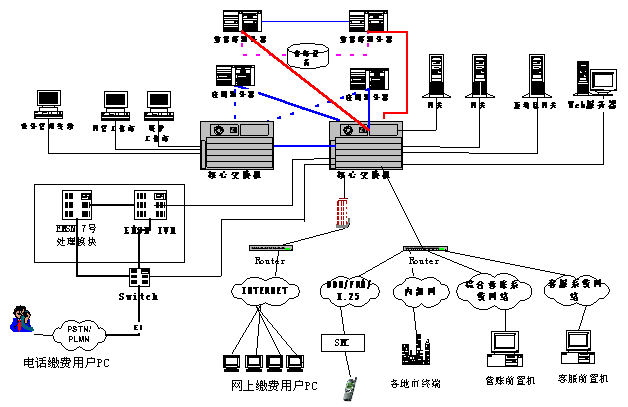 根據公司業(yè)務系統(tǒng)的組網方式,提供合適的解決方案,滿足需求,采用全省集中方式,具有以下特點:省中心建設語音處理系統(tǒng)和付費平臺業(yè)務系統(tǒng)集中在省中心;完全集中管理;完全支持全省漫游繳費;全省設備投資較少。