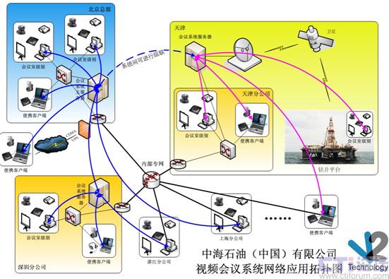系統(tǒng)建設(shè)特點(diǎn)如下   中海石油(中國(guó))有限公司V2 Conference系統(tǒng)網(wǎng)絡(luò)應(yīng)用拓?fù)鋱D: