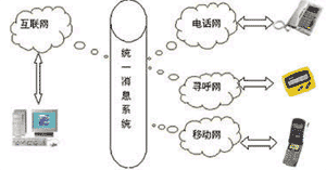 UMS可以將電子郵件、語音、尋呼、移動短消息、傳真和多媒體數(shù)據(jù)等所有信息類型集合為一個(gè)信息,并可用電話、傳真、手機(jī)、呼機(jī)、PC、掌上電腦、PDA等通信設(shè)備中的任何一種接收,在有線、無線、互聯(lián)網(wǎng)之間架構(gòu)起一個(gè)信息互聯(lián)通道(如圖)。統(tǒng)一信息系統(tǒng)(Unified