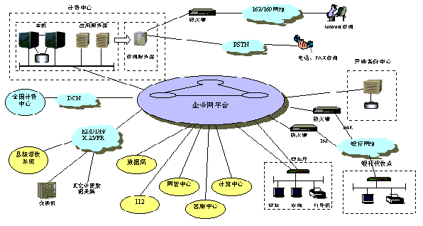 縣計費中心采用64K DDN連接各營業(yè)廳和支局,縣銀行通過銀行網(wǎng)絡(luò)連入企業(yè)網(wǎng)平臺,鄉(xiāng)鎮(zhèn)代收點視具體條件的不同可采用DDN、ISDN或PSTN方式連入計費中心。