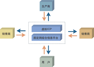 讓我們看看這樣一個應用,以固定網綜合信息平臺為基本支撐平臺,以“虛擬ICP”為業(yè)務承載平臺,包含了銷售商、生產商、供應商、消費用戶,形成了一個初步完整供應鏈系統(tǒng),如圖所示。
