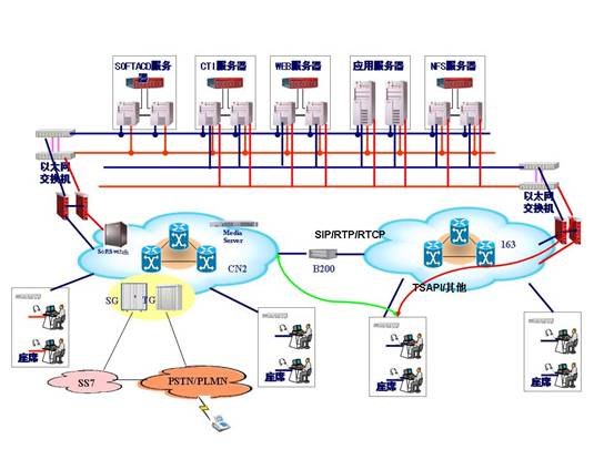 客戶座席可以分布在不同的地點(diǎn),集中在電信機(jī)房的座席可以直接部署到CN2網(wǎng)上,分布在客戶處的座席,可以部署在各地市專網(wǎng)上或者163城域網(wǎng)上。部署在163網(wǎng)和專網(wǎng)上的座席,語(yǔ)音流和SIP協(xié)議通過(guò)寬帶接入網(wǎng)關(guān)