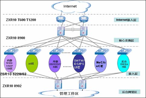 寬帶數(shù)據(jù)承載網(wǎng)主要考慮的是保證網(wǎng)絡(luò)的高可靠性(整體網(wǎng)絡(luò)結(jié)構(gòu)全冗余和設(shè)備的全冗余配置)、高可擴(kuò)展性(核心交換設(shè)備具有大容量特性和網(wǎng)絡(luò)結(jié)構(gòu)的易于拓展)、分層網(wǎng)絡(luò)結(jié)構(gòu)和高可用性。中興的解決方案中,整個(gè)網(wǎng)絡(luò)分成四個(gè)部分:Internet接入層、核心交換層、接入層、后臺管理區(qū)。