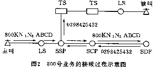 --用戶在撥打800號業(yè)務(wù)用戶號碼時,首先由網(wǎng)絡(luò)點上的普通電話交換機(jī)接收,并把800KN1N2ABCD號碼經(jīng)話路傳送給業(yè)務(wù)交換點SSP,再由SSP將此號碼經(jīng)No.7信令鏈路送到業(yè)務(wù)控制點SCP,SCP通過在業(yè)務(wù)數(shù)據(jù)庫SDP中查尋譯碼表將此號碼翻譯成普通的電話號碼回送SSP,最后由SSP負(fù)責(zé)完成電路的連接,該過程如圖2所示。