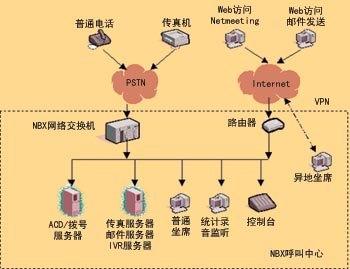 NBX網(wǎng)絡(luò)呼叫中心的核心是3Com公司的NBX網(wǎng)絡(luò)電話交換機(jī),它具有PBX的功能,支持多種外線接入方式,呼入的語音信號(hào)轉(zhuǎn)換為數(shù)據(jù)包,在局域網(wǎng)內(nèi)部傳輸,實(shí)現(xiàn)局域網(wǎng)內(nèi)部語音、數(shù)據(jù)的統(tǒng)一。坐席可以延伸到數(shù)據(jù)網(wǎng)可以達(dá)到的地方(適當(dāng)?shù)膸挘,而不受地理位置的限制。你可以通過申請(qǐng)各類專線,如VPN、DDN等,將計(jì)算機(jī)連入呼叫中心,實(shí)現(xiàn)分地域、分種類、分?jǐn)?shù)據(jù)的服務(wù)。NBX網(wǎng)絡(luò)呼叫中心擴(kuò)大了對(duì)外服務(wù)方式,通過上網(wǎng)訪問企業(yè)主頁,并使用Windows集成的Netmeeting軟件通過使用電腦的聲卡、耳機(jī)、麥克風(fēng)直接與服務(wù)代理人員進(jìn)行語音交流。