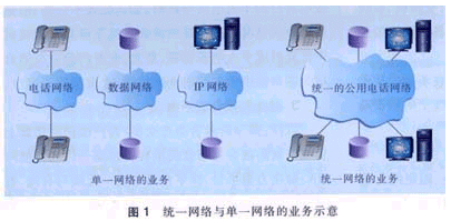 。1)數(shù)據(jù)和話音的融合進(jìn)一步促進(jìn)電話網(wǎng)絡(luò)、數(shù)據(jù)網(wǎng)絡(luò)與IP網(wǎng)絡(luò)的融合。一個(gè)統(tǒng)一的網(wǎng)絡(luò)提供各類業(yè)務(wù)顯然比各類網(wǎng)絡(luò)提供各自的業(yè)務(wù)要大大提高運(yùn)營(yíng)和服務(wù)的效率,如圖1所示。