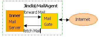 如果選用Jindi MailServer作為外部郵件服務(wù)器,可以在同一臺(tái)外部郵件服務(wù)器上配置可選的MailGate模塊,該模塊可以將指定域用戶的郵件進(jìn)行定向投遞,而不依賴DNS的配置。內(nèi)部郵件通過內(nèi)部DNS在郵件網(wǎng)關(guān)處進(jìn)行存儲(chǔ)轉(zhuǎn)發(fā)到外部。