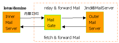 這種方案在有一定規(guī)模的企業(yè)比較典型,內(nèi)部網(wǎng)為Lotus/domino或Exchange的群件系統(tǒng),為內(nèi)部用戶提供smtp, pop3 服務(wù),一般為內(nèi)部IP地址和內(nèi)部帳戶,不具有直接發(fā)送外部郵件的功能。如果要發(fā)送外部郵件,需要配置smtp connector 或smtp-link 等模塊,相當(dāng)于上圖的MailGate模塊。同時(shí)需要更改原有l(wèi)otus/domino 或Exchange 的配置文件。