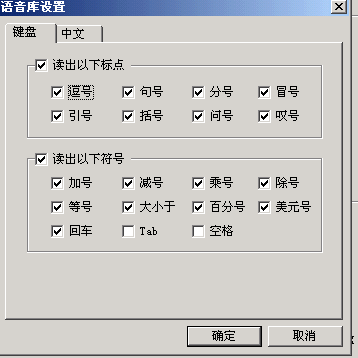 如果需要進一步的調(diào)整,可以選擇菜單里的“設置……”。打開設置窗口(如圖3)。窗口共分四個選項,每個選項里除了剛介紹的幾種常用功能調(diào)整外,還可以控制歡迎畫面、開始畫面、設定存儲等功能,規(guī)定提示速度、朗讀速度的快慢,選擇提示方式,設定提示報警條件。在“語音庫”選項中還可以選擇朗讀為男聲還是女聲。單擊“設置”按鈕,可以根據(jù)具體需要選擇“鍵盤”或“中文”里被朗讀標點符號的種類(如圖4)。