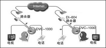 如圖1所示,通過DVC-1000標(biāo)準(zhǔn)的視音頻接口直接連接電視機(jī),也可以連接PDP顯示器、投影機(jī)等視音頻播放設(shè)備。通常情況下,一個(gè)配置了完善顯示和音響系統(tǒng)的會(huì)議室也可以直接將其接入。在與Internet互聯(lián)上,通過DVC-1000配置的標(biāo)準(zhǔn)RJ-45網(wǎng)絡(luò)接口,就可以直接將其連接到局域網(wǎng)、交換機(jī)、路由器或者Cable/DSL Modem上。圖1通過DI-604路由器與DSL Modem連接,實(shí)現(xiàn)與Internet互聯(lián)。DVC-1000還配備了一個(gè)電話機(jī)接口,可以外接一部普通電話機(jī)作為話音交流和撥號(hào)設(shè)備。