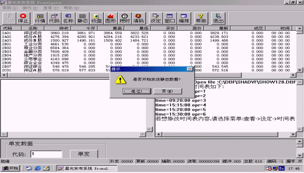 行情也可以單發(fā),只要在進行證券信息發(fā)布時在程序主界面的下方<單發(fā)數(shù)據(jù)>區(qū)輸入要單發(fā)的股票代碼,然后點擊<單發(fā)>按鈕,系統(tǒng)就會盡快刷新該只股票。