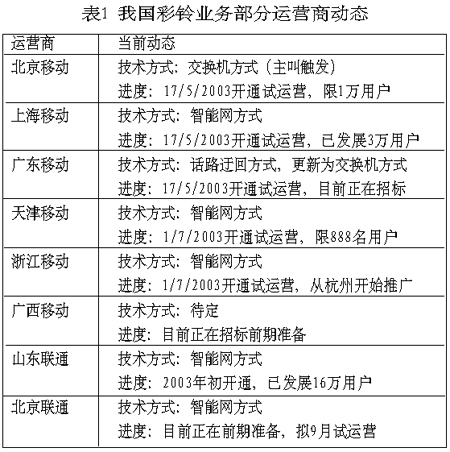 表1總結(jié)了目前我國部分運(yùn)營商彩鈴業(yè)務(wù)的發(fā)展動(dòng)態(tài)。