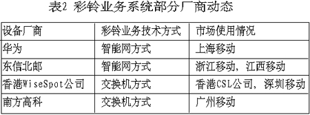 目前市場(chǎng)上有技術(shù)能力提供彩鈴業(yè)務(wù)系統(tǒng)的廠商主要有韓國的設(shè)備商Witcom和 OnionTech21,以及其他國外廠商如Comverse和WiseSpot,國內(nèi)廠商有華為、中興、南方高科、東信北郵等。各廠商都在和移動(dòng)運(yùn)營商合作部署其彩鈴業(yè)務(wù)系統(tǒng),力爭成為市場(chǎng)的領(lǐng)先者,如華為在上海移動(dòng)建設(shè)了其智能網(wǎng)方式的彩鈴業(yè)務(wù)系統(tǒng),通過其原有的智能網(wǎng)系統(tǒng)的更新升級(jí)實(shí)現(xiàn)彩鈴業(yè)務(wù)。現(xiàn)在已有確切消息證實(shí),彩鈴業(yè)務(wù)將于今年10月1日起正式商用,同時(shí)進(jìn)入商用的還有北京移動(dòng)的彩鈴業(yè)務(wù)。與此同時(shí),東信北郵也與浙江移動(dòng)、江西移動(dòng)合作開通彩鈴業(yè)務(wù),于2003年3月25日彩鈴業(yè)務(wù)通過現(xiàn)網(wǎng)實(shí)用測(cè)試。