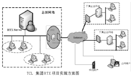 為充分發(fā)揮現(xiàn)有信息基礎(chǔ)設(shè)施和IT應(yīng)用的作用,促進企業(yè)的實時商務(wù)運作,節(jié)約開支,集團公司在廣泛調(diào)查實時企業(yè)IM軟件的基礎(chǔ)上,于2002年10月對騰訊公司的RTX實時應(yīng)用軟件前身BQQ進行了嚴(yán)格的評估和論證,認(rèn)為在如下幾個方面騰訊公司的企業(yè)IM軟件能夠解決TCL集團公司面臨的實際問題:①業(yè)務(wù)地點分散,網(wǎng)絡(luò)結(jié)構(gòu)復(fù)雜;②業(yè)務(wù)復(fù)雜,無法形成集中統(tǒng)一的工作流管理系統(tǒng);③人員素質(zhì)差異性較大,復(fù)雜的IT應(yīng)用如OA系統(tǒng)等應(yīng)用推廣受到一定阻力;④集團內(nèi)部缺乏一個公共實時交流平臺,企業(yè)內(nèi)部溝通不暢;目前集團公司內(nèi)部主要通過電話、傳真和E_mail這些傳統(tǒng)工具傳遞信息,企業(yè)的實時化大受影響。而且騰訊公司的RTX產(chǎn)品投入低,上手快,于是TCL集團領(lǐng)導(dǎo)決定上馬RTX項目,自上而下推廣RTX項目。