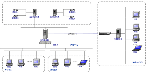下屬各單位辦公區(qū)的工作終端或遠程(Internet)終端,可以連接到中心機房的轉(zhuǎn)播服務器上進行接收數(shù)據(jù)。用戶只需直接打開IE瀏覽器然后輸入轉(zhuǎn)播服務器的IP地址或者相關鏈接,進入到正在直播的會議現(xiàn)場,實現(xiàn)遠程實時參與會議的目的。