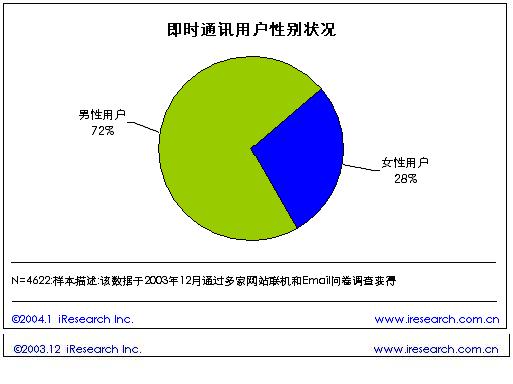 根據(jù)艾瑞市場咨詢(iResearch)的《2003年中國即時(shí)通訊研究報(bào)告》研究結(jié)果表明,在中國的即時(shí)通訊用戶中,72%的即時(shí)通訊用戶為男性,占據(jù)了大部分份額。女性用戶僅僅占28%。看來男性網(wǎng)民更喜歡在網(wǎng)上聊天。