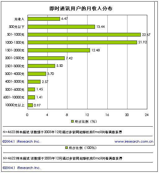 從收入情況來看,即時(shí)通訊用戶仍然以低收入為主,其中月收入低于1500元的用戶比例高達(dá)64.5%,這可能與使用即時(shí)通訊的用戶主要是學(xué)生和普通公司職員的緣故。
