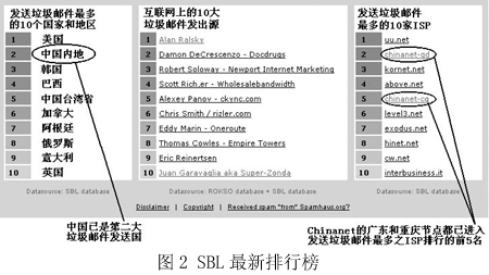 圖2是國際上著名的反垃圾郵件組織Spamhaus在網(wǎng)站上列出的統(tǒng)計(jì)排行榜,“China”已經(jīng)穩(wěn)居第二大垃圾郵件發(fā)送國的位置,而右邊的一個(gè)排行榜則從另一個(gè)角度向我國敲響了警鐘——在專為發(fā)送垃圾郵件的ISP所列的黑名單SBL中,我國Chinanet的兩個(gè)省級(jí)ISP在前10名中分列第2和第5名。而Chinanet作為中國的公用信息互聯(lián)網(wǎng)絡(luò),是我國的Internet骨干網(wǎng),是國內(nèi)用戶接入互聯(lián)網(wǎng)的主要途徑之一。“我們真不希望以這樣的方式‘揚(yáng)名海外’”,來自一家ISP的一位不肯透露姓名的女士說,“其實(shí)我們也是受害者!”