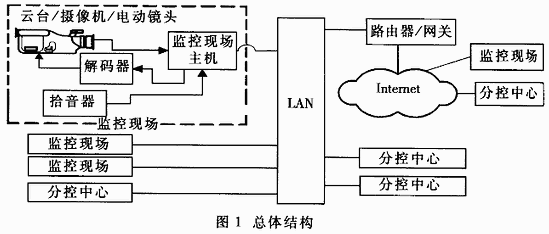 遠程監(jiān)控系統(tǒng)一般包括三部分:前端監(jiān)控現(xiàn)場、通信設(shè)備和后端分控中心。整個系統(tǒng)基于Client/Server(客戶機/服務(wù)器)模式?傮w結(jié)構(gòu)如圖1所示。