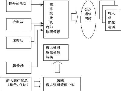 交換機(jī)識(shí)別了病人代碼后,自動(dòng)轉(zhuǎn)換成病人和其家屬的通信工具號(hào)碼呼出,所用電話上顯示的是病人代碼,實(shí)現(xiàn)了呼叫過程與號(hào)碼隔離。