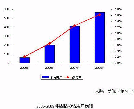 《固網(wǎng)增值業(yè)務(wù)研究系列報(bào)告-彩鈴彩話2005》中易觀國(guó)際認(rèn)為,固話彩話業(yè)務(wù)將難以像小靈通彩鈴那樣得到廣泛的應(yīng)用,但是能夠在細(xì)分市場(chǎng)中滿足固話用戶的個(gè)性化需求。易觀國(guó)際預(yù)測(cè),2005年國(guó)內(nèi)固話彩話用戶總數(shù)將達(dá)到60萬(wàn)戶,市場(chǎng)規(guī)模為1,000萬(wàn)元人民幣;到2008年,固話彩話用戶超過(guò)550萬(wàn)戶,市場(chǎng)規(guī)模將超過(guò)1.7億元人民幣。