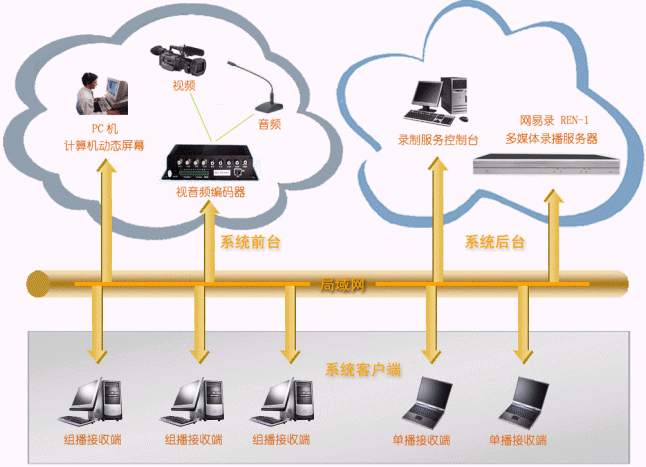 - 系統(tǒng)后臺:連接在網(wǎng)絡(luò)上即可,接受REN-1服務(wù)器管理端發(fā)送來的系統(tǒng)管理、維護指令,并負(fù)責(zé)將系統(tǒng)前臺發(fā)送來的視頻、音頻、計算機動態(tài)屏幕進行實時錄制和直播,它包括:網(wǎng)易錄媒體中心(REN-1),它為系統(tǒng)的核心,主要完成視頻、音頻、計算機動態(tài)屏幕的錄制和直播;