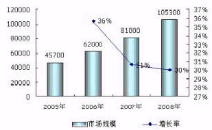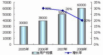 2006年1月?lián)Z盛發(fā)布的最新《2005-2006年移動(dòng)增值業(yè)務(wù)市場(chǎng)回顧與展望》報(bào)告數(shù)據(jù)顯示,2005年中國(guó)的移動(dòng)增值業(yè)務(wù)用戶規(guī)?倲(shù)達(dá)到了3億,市場(chǎng)規(guī)模達(dá)到近近4588億元。諾盛預(yù)計(jì),2006年移動(dòng)增值業(yè)務(wù)用戶規(guī)模將達(dá)到3.9億,市場(chǎng)規(guī)模為620億元;2007年在3G的刺激下,移動(dòng)增值業(yè)務(wù)用戶規(guī)模將達(dá)到5億,市場(chǎng)規(guī)模為810億元;2008年用戶規(guī)模將達(dá)到6億,市場(chǎng)規(guī)模為1053億。移動(dòng)增值業(yè)務(wù)用戶規(guī)模年增長(zhǎng)率在20%以上,市場(chǎng)規(guī)模增長(zhǎng)率在30%以上。