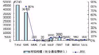 2005年包含運(yùn)營(yíng)商通信費(fèi)收入在內(nèi)的中國(guó)移動(dòng)增值業(yè)務(wù)市場(chǎng)總規(guī)模為457.4億元,其中,包括SMS、CaiE、JAVA、BREW等在內(nèi)的移動(dòng)數(shù)據(jù)增值業(yè)務(wù)市場(chǎng)規(guī)模占到總體增值市場(chǎng)規(guī)模的90%,達(dá)到411.66億元;包括IVR,CRBT等在內(nèi)的移動(dòng)語(yǔ)音增值業(yè)務(wù)市場(chǎng)規(guī)模為57.4億元,占總體市場(chǎng)規(guī)模的10%。