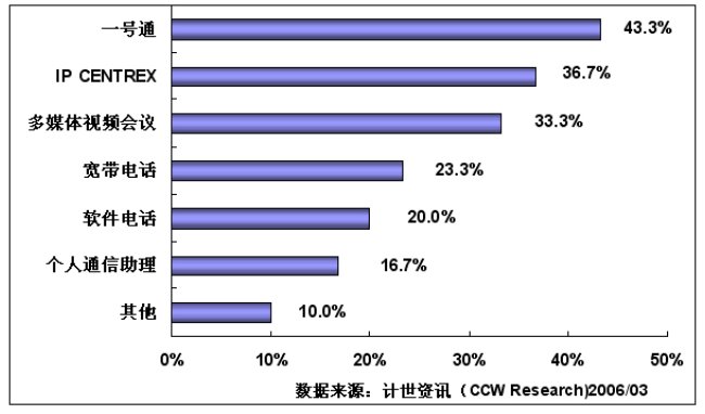 通過(guò)計(jì)世資訊(CCW Research)的調(diào)研可以看到,行業(yè)用戶(hù)對(duì)一號(hào)通、IP-CENTREX、多媒體視頻會(huì)議和寬帶電話(huà)等基于NGN平臺(tái)開(kāi)發(fā)的業(yè)務(wù)比較感興趣,其中:對(duì)一號(hào)通感興趣的用戶(hù)達(dá)到43.3%,對(duì)IP-CENTREX感興趣的用戶(hù)為36.7%,對(duì)多媒體視頻會(huì)議感興趣的用戶(hù)達(dá)到33.3%,對(duì)寬帶電話(huà)感興趣的用戶(hù)達(dá)到23.3%,對(duì)軟件電話(huà)感興趣的用戶(hù)達(dá)到20.0%,對(duì)個(gè)人通信助理感興趣的用戶(hù)達(dá)到16.7%。