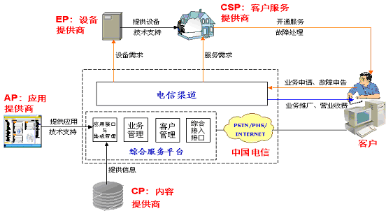 中國(guó)電信:綜合信息服務(wù)提供商,提供品牌、平臺(tái)、接入和渠道,負(fù)責(zé)業(yè)務(wù)的組織、運(yùn)營(yíng)、銷(xiāo)售和管理,并為客戶(hù)提供統(tǒng)一的服務(wù)界面。