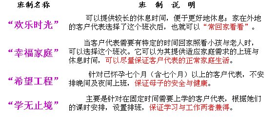 通過流程優(yōu)化,可以大大提高組織的運(yùn)營效率和工作質(zhì)量,如:我們通過對(duì)員工排班流程的優(yōu)化,大大提高了客戶服務(wù)中心人員的利用效率、服務(wù)質(zhì)量,同時(shí),還提高了員工滿意度。我們通過對(duì)流程中第3、4、5步工作方法的改進(jìn),大大提高了人員利用率,且提高幅度達(dá)20%以上。同樣,通過對(duì)第6步班次設(shè)置的改進(jìn),實(shí)施了個(gè)性化的班次設(shè)置(見表2),如:針對(duì)喜歡有整天休息時(shí)間,及家在外地的客戶代表,設(shè)置了“歡樂時(shí)光”輪班,為大家提供較長的休息時(shí)間,如兩天以上的連休,便于回家與更好地休息;針對(duì)家里有小孩子或老人、需在固定時(shí)間回家的客戶代表,設(shè)置了“幸福家庭”輪班,為他們提供適應(yīng)家庭需求的上班與休息時(shí)間,盡量保證員工的正常家庭生活;針對(duì)已懷孕及哺乳期的客戶代表,設(shè)置了“希望工程”輪班,不安排晚間及夜間上班,保證了母子的安全與健康;針對(duì)在固定時(shí)間需要上學(xué)的客戶代表,設(shè)置了“學(xué)無止境”輪班,主要是根據(jù)她們的課時(shí)安排設(shè)置排班,保證學(xué)習(xí)與工作兩者兼得。這種做法大大加強(qiáng)了員工積極性,并提高了員工的滿意度。
