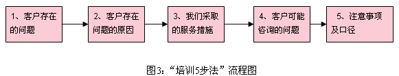 從上圖,我們可以看出,影響服務(wù)質(zhì)量主要有A、B兩個關(guān)鍵控制點,決定A點服務(wù)質(zhì)量的主要是排班流程,它影響客戶接入的速度和客戶的等待時間,即決定了10086的接通率;決定B點服務(wù)質(zhì)量的主要是培訓(xùn)流程,它直接影響服務(wù)人員的業(yè)務(wù)知識和服務(wù)能力,從而影響服務(wù)質(zhì)量。由此,我們優(yōu)化了排班流程、新建了客服代表的培訓(xùn)流程,有效地保證了上述關(guān)鍵環(huán)節(jié)的服務(wù)質(zhì)量。排班流程優(yōu)化的具體方法在筆者的前一篇文章《流程與組織能力》中已經(jīng)作了詳細的介紹,下面結(jié)合實際來介紹我們新的培訓(xùn)流程-“培訓(xùn)五步法”。