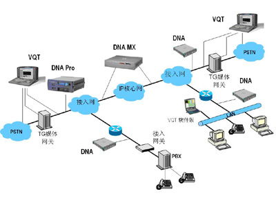 以上兩種測試方法也可以結(jié)合使用,在進(jìn)行端到端VQT測試時,在NGN網(wǎng)絡(luò)的中間網(wǎng)段(根據(jù)需要可以設(shè)置多個監(jiān)測點)部署分布式網(wǎng)絡(luò)分析儀(DNA),進(jìn)行被動式RTP/RTCP監(jiān)測,從而判斷出造成語音質(zhì)量下降的環(huán)節(jié)所在。如下圖所示: