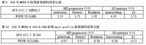 對(duì)視頻編碼標(biāo)準(zhǔn)進(jìn)行客觀評(píng)價(jià)的常用方法是峰值信噪比PSNR。表9、表10分別給出了AVS與MPEG-2標(biāo)準(zhǔn)以及AVS與MPEG-4 AVC/H.264標(biāo)準(zhǔn)main