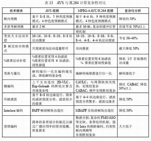 表13對(duì)AVS與H.264的計(jì)算實(shí)現(xiàn)復(fù)雜性進(jìn)行扼要對(duì)比,大致估算,AVS解碼復(fù)雜度相當(dāng)于H.264的30%,AVS編碼復(fù)雜度相當(dāng)于H.264的70%。