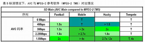 總體上講,AVC與MPEG-2對(duì)比,85個(gè)比對(duì)中66對(duì)MPEG-2的碼率要達(dá)到1.5倍才能與AVC達(dá)到同樣質(zhì)量,其中51對(duì)MPEG-2碼率要達(dá)到AVC的2倍才能達(dá)到AVC的質(zhì)量。換句話(huà)說(shuō),在60%的情況下,AVC的編碼效率能夠達(dá)到MPEG-2的兩倍。