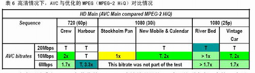 由表可以看出,AVC與優(yōu)化的MPEG-2高清編碼器比,9個(gè)可比項(xiàng)中有7個(gè)的N大于等于1.7,有3個(gè)大于等于2,有一個(gè)等于3.3。
