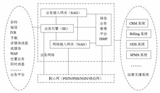 在電信集團(tuán)的統(tǒng)一規(guī)劃下,ISMP和SAG相繼推出。ISMP是綜合增值業(yè)務(wù)管理平臺(tái),ISMP不但可以解決現(xiàn)網(wǎng)固網(wǎng)/PHS業(yè)務(wù)管理的問題,而且可以配合促進(jìn)3G業(yè)務(wù)試驗(yàn)和體驗(yàn),不斷完善,進(jìn)行增值業(yè)務(wù)價(jià)值鏈、業(yè)務(wù)內(nèi)容合作,收集市場需求和完善的增值業(yè)務(wù)應(yīng)用模式,整合和強(qiáng)化現(xiàn)有的市場營銷環(huán)節(jié)。SAG是業(yè)務(wù)接入網(wǎng)關(guān),它包含與業(yè)務(wù)引擎的“業(yè)務(wù)能力驅(qū)動(dòng)”接口,包含與ISMP的“SP/用戶管理”接口,包含對移動(dòng)和固定網(wǎng)絡(luò)的支持。ISMP、SAG與業(yè)務(wù)平臺(tái)和周邊支撐系統(tǒng)的關(guān)系如圖7所示。