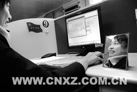 12319服務(wù)熱線中心有13個工作臺,每個工作臺前都有一面鏡子。該中心的負責(zé)同志說,這面鏡子是檢驗工作人員是否微笑服務(wù)的“晴雨表”。鏡子是今年初安裝的,大家還給它起了一個響亮的名字:“微笑鏡”。