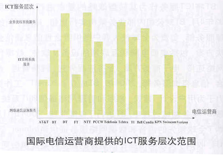 ICT服務(wù)的范圍大致可分為三個層次,一是面向網(wǎng)絡(luò)通信設(shè)施(包括網(wǎng)絡(luò)規(guī)劃、網(wǎng)絡(luò)系統(tǒng)集成、外包管理等)的服務(wù),二是面向IT應(yīng)用系統(tǒng)(包括軟件系統(tǒng)支持與維護、系統(tǒng)集成、應(yīng)用托管等)的服務(wù),三是面向業(yè)務(wù)流程系統(tǒng)(包括系統(tǒng)咨詢、業(yè)務(wù)流程外包等)的服務(wù)。從客戶視角來看,第三種服務(wù)的層次最高,第一種服務(wù)的層次最低,而電信運營商提供的ICT服務(wù)層次越高,則表明其在該領(lǐng)域拓展的范圍越廣。上述國際電信運營商提供的ICT服務(wù)層次范圍如下圖所示。