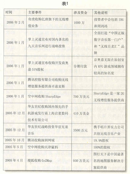 從2003年開始,國(guó)內(nèi)就顯現(xiàn)出并購(gòu)增值服務(wù)運(yùn)營(yíng)企業(yè)的苗頭。2004年以來(lái),隨著整治增值服務(wù)運(yùn)營(yíng)企業(yè)的力度不斷加大,并購(gòu)漸成風(fēng)潮(見表1)。2004年2月,新浪收購(gòu)深圳網(wǎng)興科技公司;2004年5月,搜狐收購(gòu)手機(jī)WAP服務(wù)提供商北京吉菲爾公司。2005年,在“超級(jí)女生”節(jié)目大獲成功后,掌上靈通宣布將對(duì)國(guó)內(nèi)著名的九天音樂(lè)網(wǎng)進(jìn)行戰(zhàn)略投資,全面打造“中國(guó)正版數(shù)字音樂(lè)第一門戶”和“無(wú)線百老匯”品牌。各大移動(dòng)增值業(yè)務(wù)服務(wù)商通過(guò)并購(gòu)競(jìng)爭(zhēng)對(duì)手,門戶網(wǎng)站可以在移動(dòng)增值服務(wù)領(lǐng)域?qū)で笮碌耐黄,獲得可觀的利益,增強(qiáng)自身的競(jìng)爭(zhēng)力。伴隨著3G商用的日益臨近和市場(chǎng)競(jìng)爭(zhēng)的不斷加劇,主流SP(服務(wù)提供商)進(jìn)一步加快了資本購(gòu)并和業(yè)務(wù)整合的步伐,整個(gè)SP行業(yè)將加速洗牌。經(jīng)過(guò)市場(chǎng)整合,主流SP將不斷做大做強(qiáng),而相當(dāng)多的缺乏市場(chǎng)競(jìng)爭(zhēng)力的SP將被淘汰出局。