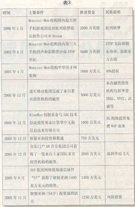 近幾年來(lái),一些資本投資商將投資的重點(diǎn)放到了無(wú)線音樂(lè)、手機(jī)游戲和手機(jī)視訊等業(yè)務(wù)領(lǐng)域,逐步加大了對(duì)SP的投資力度(見表3)。進(jìn)入2005年以來(lái),著眼于2.5G向3G的全面演進(jìn),風(fēng)險(xiǎn)投資對(duì)SP的投資力度進(jìn)一步加大。以滾石移動(dòng)為例,在2002年和2004年獲得兩輪風(fēng)險(xiǎn)投資之后,滾石移動(dòng)憑借在無(wú)線音樂(lè)領(lǐng)域取得的良好市場(chǎng)業(yè)績(jī),又獲得了智基創(chuàng)投、華登國(guó)際、聯(lián)想投資等公司的投資,投資金額達(dá)3000萬(wàn)美元。繼2004年10月獲得IDG投資以后,2005年12月7日,國(guó)內(nèi)著名的數(shù)字音樂(lè)門戶——A8音樂(lè)集團(tuán)獲得了包括IDG和Intel投資公司在內(nèi)的5家國(guó)際著名投資機(jī)構(gòu)的投資,投資金額達(dá)2000萬(wàn)美元。同月,掌中無(wú)限則獲得了來(lái)自全球性風(fēng)險(xiǎn)投資商BlueRun創(chuàng)投基金和IDG總額達(dá)上千萬(wàn)美元的投資。