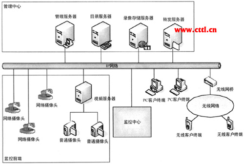 圖中管理中心和監(jiān)控前端、監(jiān)控中心是視頻監(jiān)控系統(tǒng)的組成部分,無(wú)線網(wǎng)絡(luò)部分則是視頻監(jiān)控和其他系統(tǒng)互通的一個(gè)示例。當(dāng)然視頻監(jiān)控系統(tǒng)和其他業(yè)務(wù)網(wǎng)絡(luò)共同使用時(shí),也可能會(huì)融為一體。