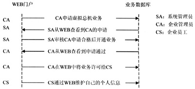 虛擬總機(jī)系統(tǒng)開戶流程采用WEB方式實(shí)現(xiàn),以此完成用戶對虛擬總機(jī)業(yè)務(wù)的定購、系統(tǒng)管理員對用戶開戶申請的審核、用戶業(yè)務(wù)參數(shù)的控制等操作,最后企業(yè)員工可以在企業(yè)管理員許可業(yè)務(wù)后,登陸WEB門戶管理個(gè)人信息。具體流程如圖2所示。